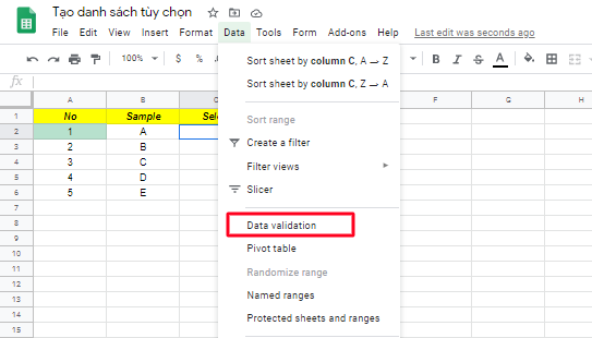 Step 1: chọn ô mà bạn muốn tạo danh sách tùy chọn