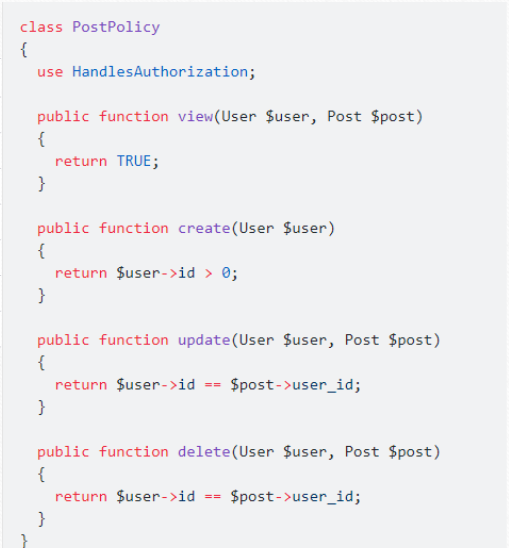 Giống với gate, policy cũng là một bộ lọc để thực việc xác thực, hành động nào là hành động được phép, hành động nào là không được phép. Nhận tham số đầu tiên là một thể hiện của user, và là user đang đăng nhập vào.