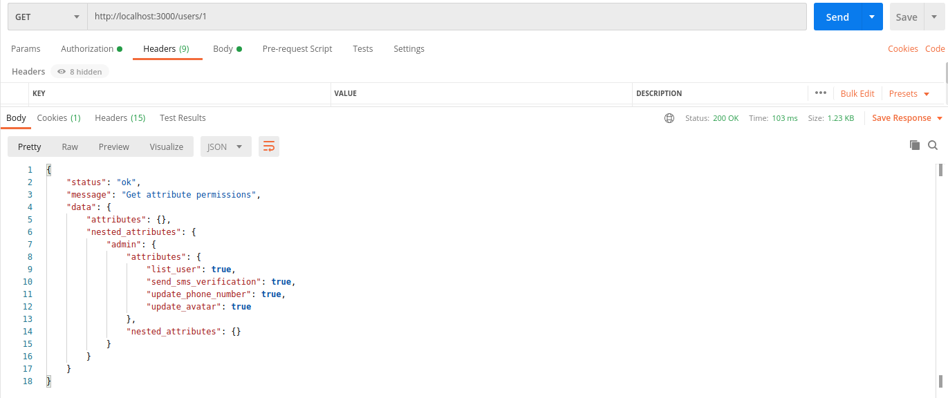 permissions của user đã được thiết lập nhưng theo data hiện tại hiện chưa cho phép user này với action list_user trong group admin. Chúng ta update được permission này tại role admin true thì user sẽ có quyền vào action tương ứng.