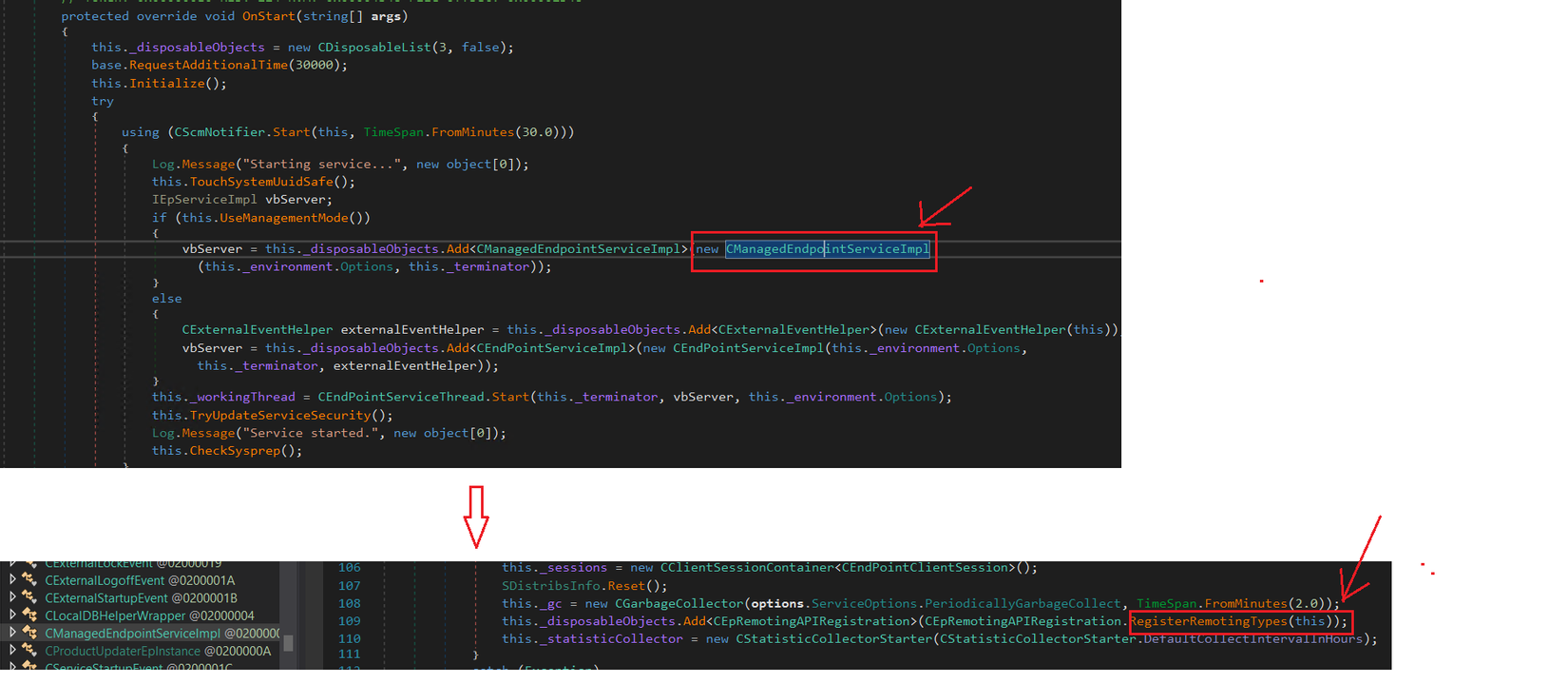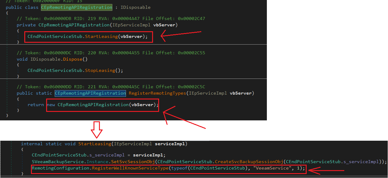Đến đây gần như ta đã có thể khai thác lỗi thông qua .NET remoting, tuy nhiên ta cần phải biết tên của service thì mới có thể khai thác thành công. Quay lại với method OnStart, thông qua document tại đây ta được biết rằng method này sẽ tự động được thực hiện khi hệ điều hành khởi động. Khi xem xét kĩ hơn ở trong thân của OnStart thì cả nhánh If lẫn nhánh else đều gọi đến CEpRemotingAPIRegistration.RegisterRemotingType(this). Từ đó dẫn đến đoạn code đăng kí dịch vụ có tên là VeeamService như hình dưới.