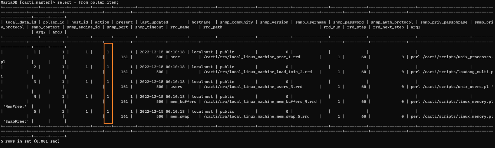 Để khai thác thành công attacker buộc phải cung cấp host_id và local_data_id sao cho action tương ứng trong poller_item bằng 2. Cách này có thể thực hiện bằng cách brute force trên target thực tế. Tuy nhiên, mặc định khi cài Cacti, trong bảng poller_item không có action nào có giá trị là 2.