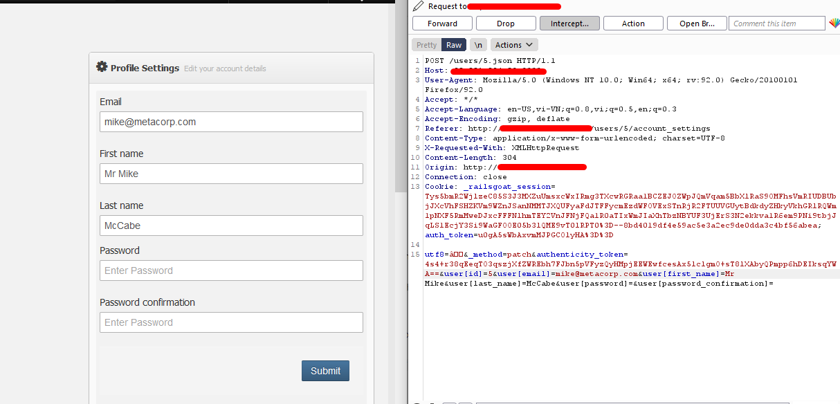 Thực hiện cập nhật thông tin user và bắt lại request bằng Burpsuite (Một công cụ proxy giúp chúng ta có thể monitor request trước khi trình duyệt gửi lên server). Mặc dù chúng ta thấy không hề có input nhập user[id] ở trong form nhưng request gửi lên vẫn có tham số này. Vì vậy chúng ta cần kiểm soát tất cả các tham số chứ không chỉ những tham số có trong form. Công cụ BurpSuite giúp chúng ta dễ dàng quan sát được.