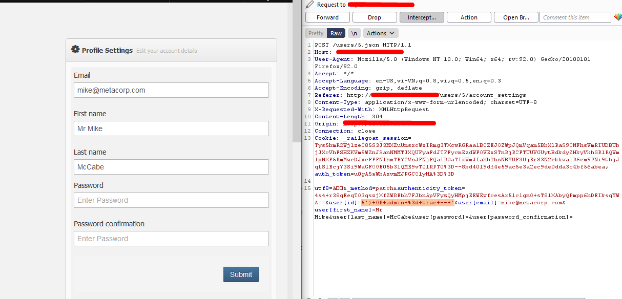 Khai thác bằng cách thay đổi id thành: user[id]=5') OR admin = true -- '. Và thực hiện sửa request thành request đổi mật khẩu user. Lúc này câu truy vấn của chúng ta sẽ thực hiện như sau:
