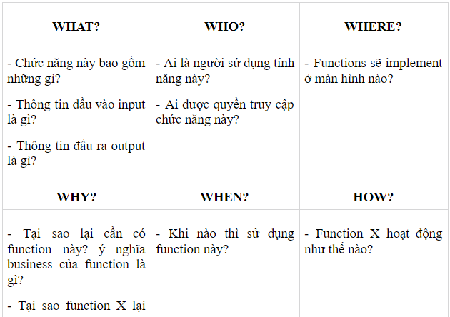 Dùng Q&A mở (5W1H): khi spec của function X đã có, nhưng chưa thực sự rõ ràng.