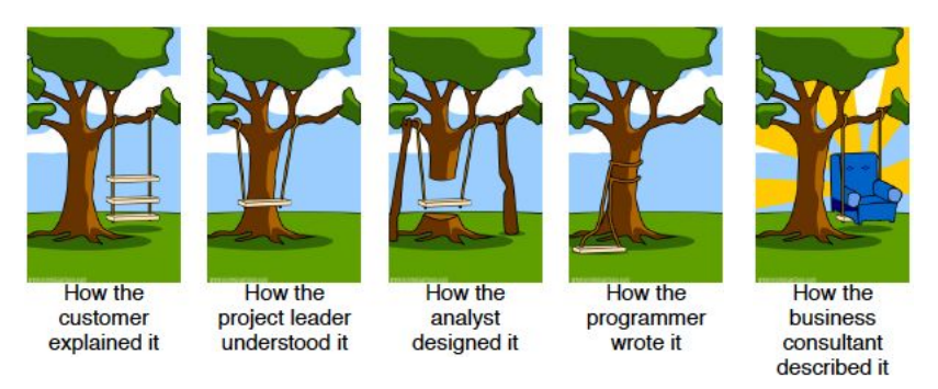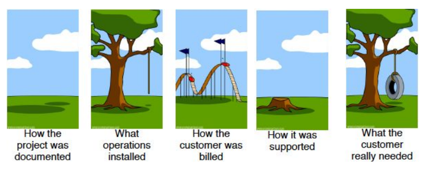 Từ hình ảnh trên có thể thấy, phân tích requirement sơ sài dẫn tới việc sản phẩm cuối cùng không đáp ứng được yêu cầu khách hàng, số tiền phải trả cho việc phát triển dự án là rất lớn. Do đó, khi phân tích requirement cần phân tích một cách cẩn thận, rõ ràng và chi tiết.