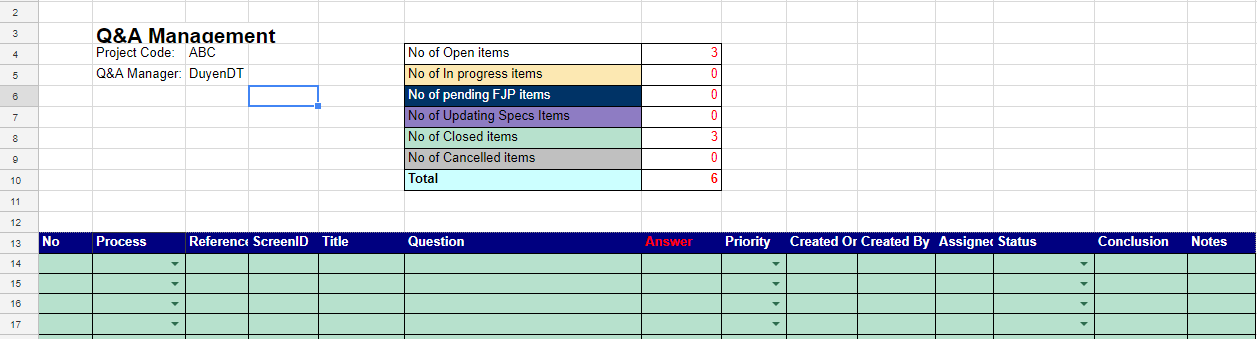 Q&A là từ viết tắt của Question and Answer (hỏi và trả lời), thường được viết dưới dạng tệp excel. Tệp này bao gồm tất cả các câu hỏi trong dự án, đặc biệt là các câu hỏi về tài liệu yêu cầu của khách hàng về sản phẩm phần mềm.