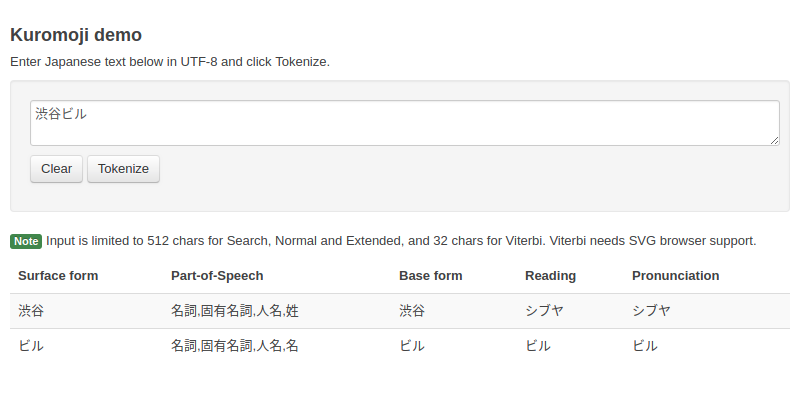 Kuromoji sẽ phân tích tham số truyền vào là 1 đoạn text, sau đó tách ra chữ cái để phân tích từng chữ, out put đầu ra là các feature. Các bạn có thể vào trang https://www.atilika.org/kuromoji/ để xem demo được rõ hơn. Một ví dụ sau: