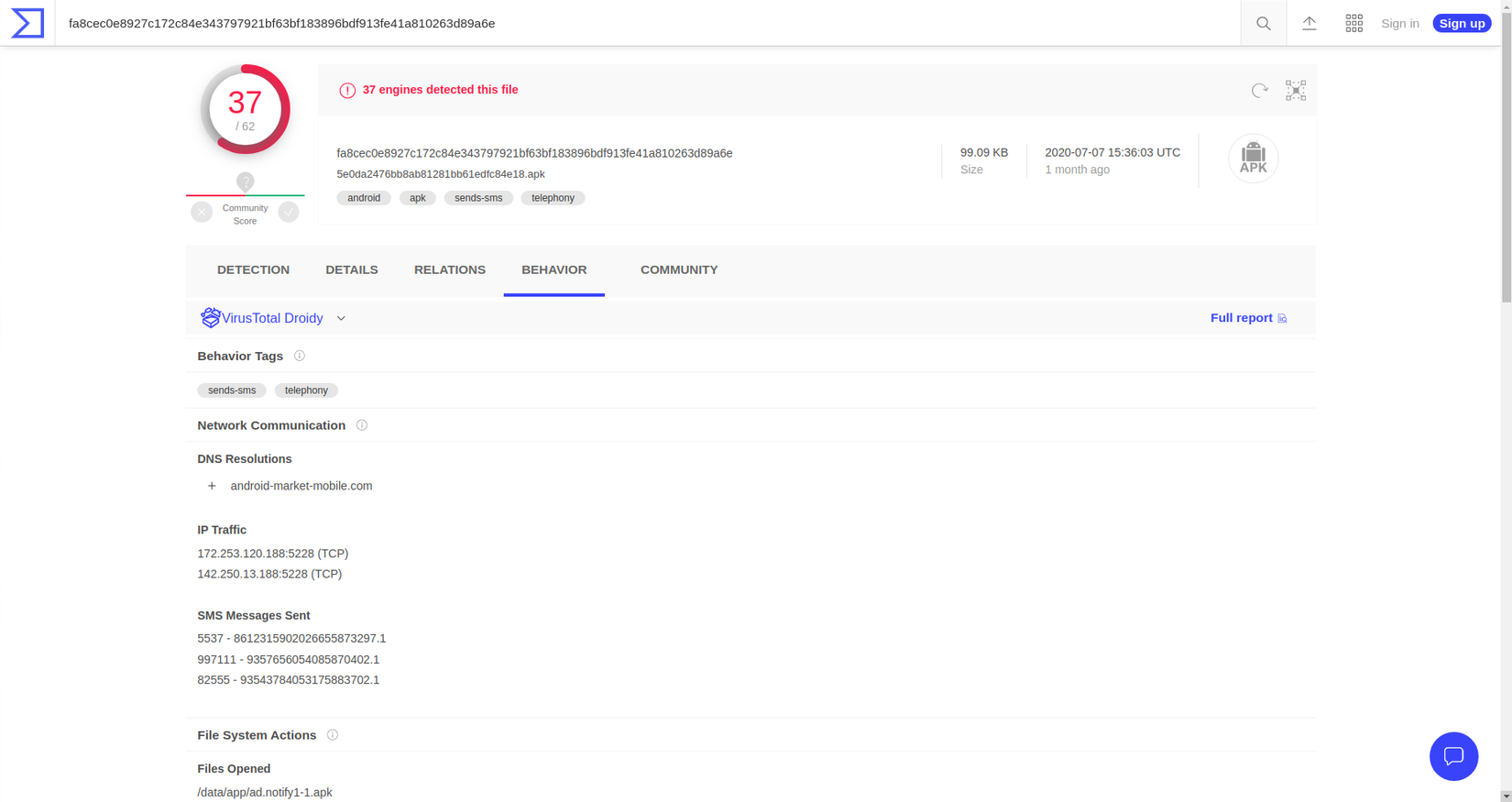 "permalink": "https://www.virustotal.com/gui/file/fa8cec0e8927c172c84e343797921bf63bf183896bdf913fe41a810263d89a6e/detection/f-fa8cec0e8927c172c84e343797921bf63bf183896bdf913fe41a810263d89a6e-1589766721"