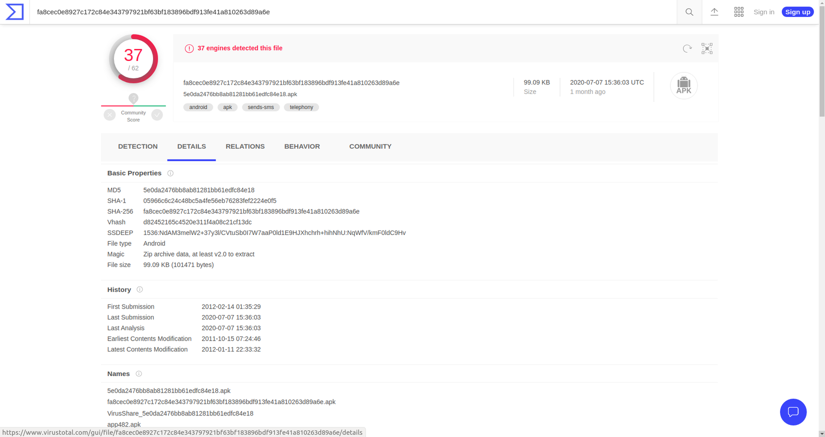 - History: thời gian các ứng dụng tương tự được upload lên virustotal để kiểm tra