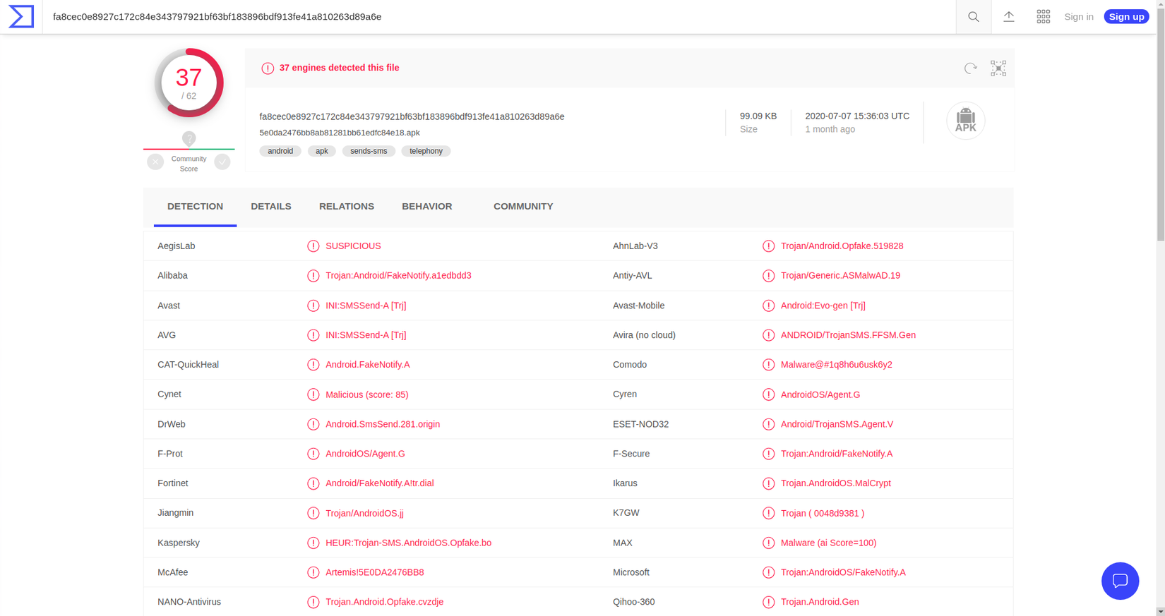 "permalink": "https://www.virustotal.com/gui/file/fa8cec0e8927c172c84e343797921bf63bf183896bdf913fe41a810263d89a6e/detection/f-fa8cec0e8927c172c84e343797921bf63bf183896bdf913fe41a810263d89a6e-1589766721",