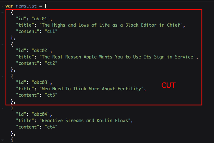Đầu tiên là tạo 1 biến dữ liệu, tạm dùng thôi, chứ thực tế thì nó sẽ khác tý, mọi người hay lấy từ API, các bạn tạo nhiều tí cho dễ xem