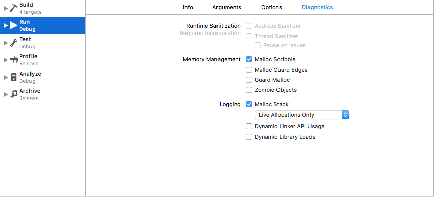 1. Chọn các thuộc tính qua Xcode scheme editor