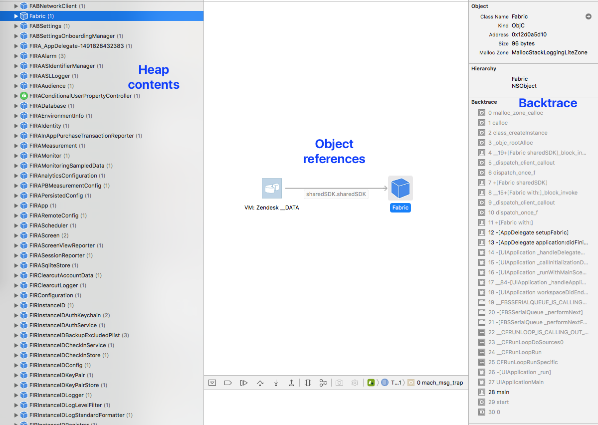 Memory graph debugger giúp tìm và sửa các "retain cycles" và "memory leak". Khi được kích hoạt, nó tạm dừng thực thi ứng dụng và hiển thị các đối tượng hiện tại trên heap, cùng với các mối quan hệ của chúng và các tham chiếu nào đang giữ cho chúng tồn tại.