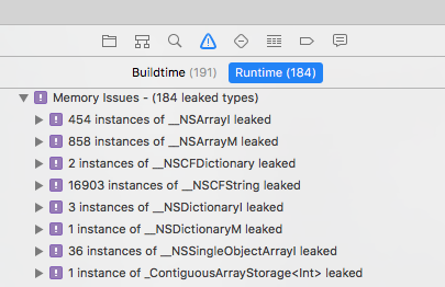 Nhược điểm: Gặp các trường hợp không phải retain cycles hoặc leak. Ví dụ — Khi chúng ta khởi tạo một UIButton object và thêm nó vào một UIToolBars item array: chúng ta sẽ thấy nó được xác định là memory leaks nhưng lại không biết tại sao ??