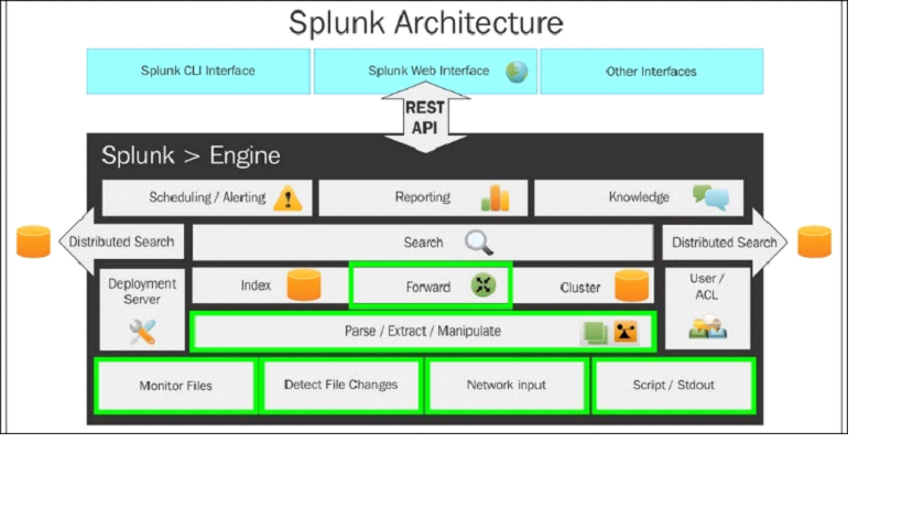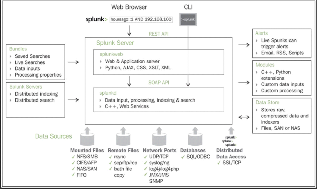 Splunk hỗ trợ hai loại triển khai: triển khai độc lập và triển khai phân tán. Tùy thuộc vào loại triển khai, tìm kiếm tương ứng được thực hiện. Công cụ Splunk có các thành phần bổ sung khác của quản lý dữ liệu, báo cáo và lên kế hoạch, và cảnh báo. Toàn bộ công cụ Splunk được tiếp xúc với người dùng thông qua Splunk CLI, Splunk Web Interface, và Splunk SDK, được hỗ trợ bởi hầu hết các ngôn ngữ.