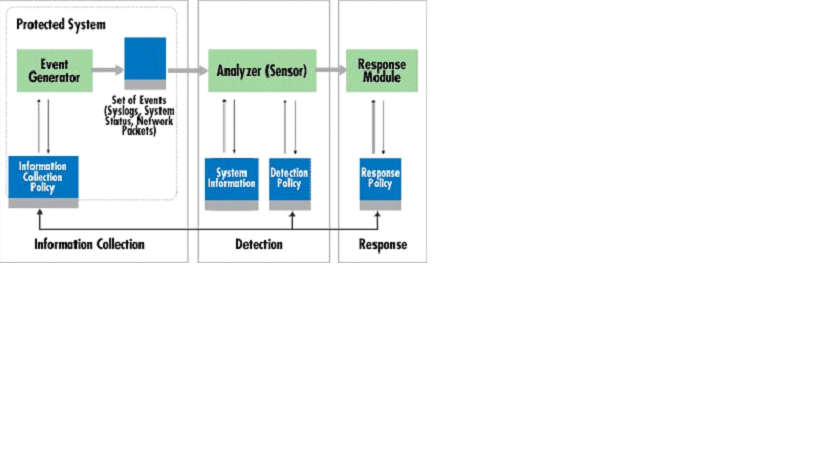 IDS bao gồm các thành phần chính: thành phần thu thập gói tin (information collection), thành phần phân tích gói tin (Detection), thành phần phản hồi (response) nếu gói tin đó được phát hiện là một cuộc tấn công.