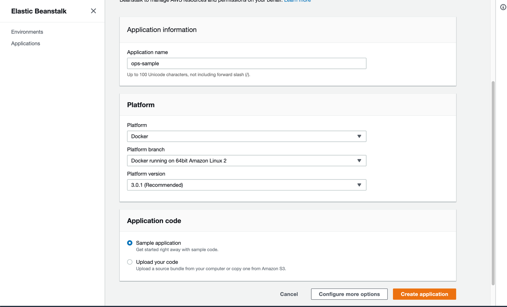 Mục tiêu của demo để mọi người có thể hình dung khái quát cách thức hoạt động của một dự án tích hợp CI trong phát triễn một cách đơn giản nhất, bài viết không đi sâu vào các công nghệ. Các bạn có thể tham khảo source code mình đã viết sẵn. Để deploy demo mình sử dụng dịch vụ của Amazon là Amazon ElasticBeanstalk là một service giúp deploy một web app một cách nhanh chóng. Các bạn có thể chọn service ElasticBeanstalk và tạo một application. Ở mục platform các bạn có thể lựa chọn platform tương ứng, ở đây mình sử dụng Docker.