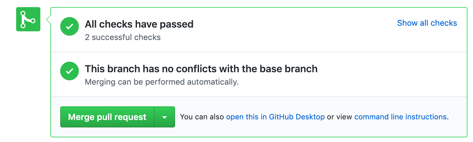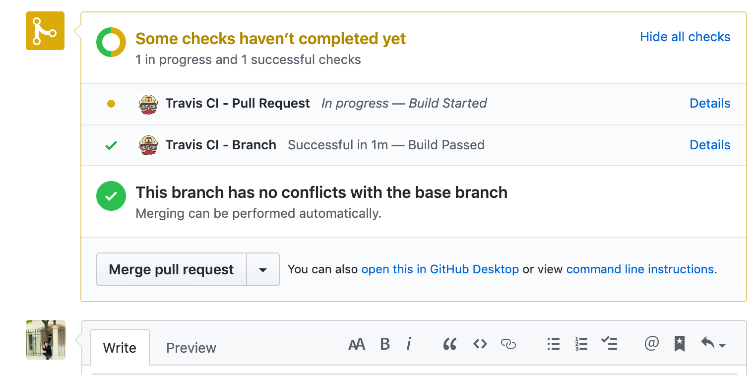 Sau khi thực hiện xong quá trình chạy CI ta nhận được một pull request đã được kiểm tra thông qua unit tests, các bạn hoàn toàn có thể thực hiện nhiều công việc như chạy linter, codeclimate, ... để kiểm tra đảm bảo chất lượng code. Nếu các tiến trình được thực hiện thành công ta nhận được 1 pull request sẵn sàng cho việc merge, tích hợp, trái lại TravisCI sẽ trả lại thông báo lỗi khi các tiến trình phát sinh lỗi giúp cho developer có thể phát hiện và sửa lỗi.