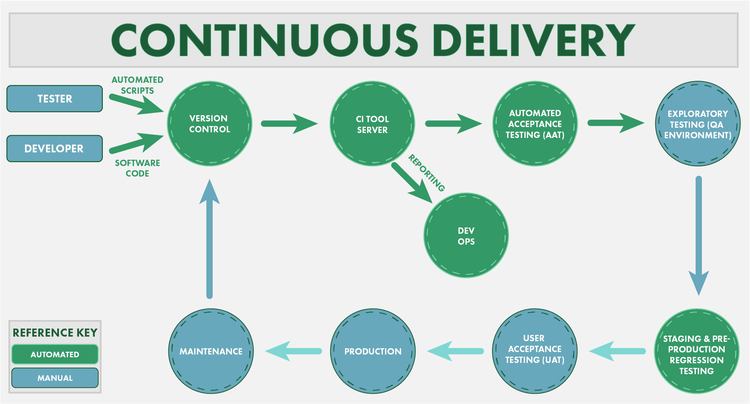 Continuous Deliveryhay còn gọi là "Chuyển giao liên tục" là quy trình để triển khai các thay đổi về code đến môi trường Staging một cách tự động. Môi trường Staging là một môi trường mô phỏng của môi trường Production. Tại đây sản phẩm sẽ được trải qua những bài test để đảm bảo chất lượng một cách tự động để sẵn sàng deploy lên môi trường Production.![]()