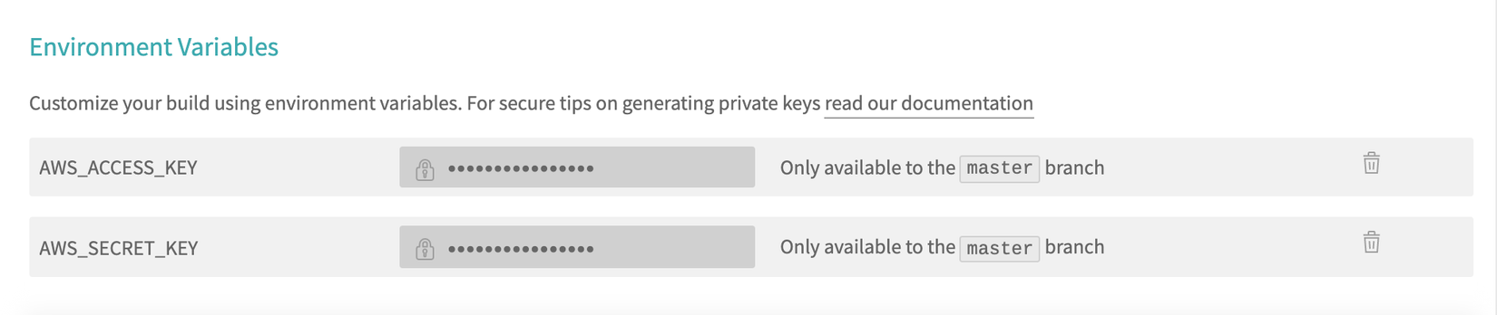 Một số biến môi trường cần được thiết lập trong setting của TravisCI để đảm bảo tính bảo mật