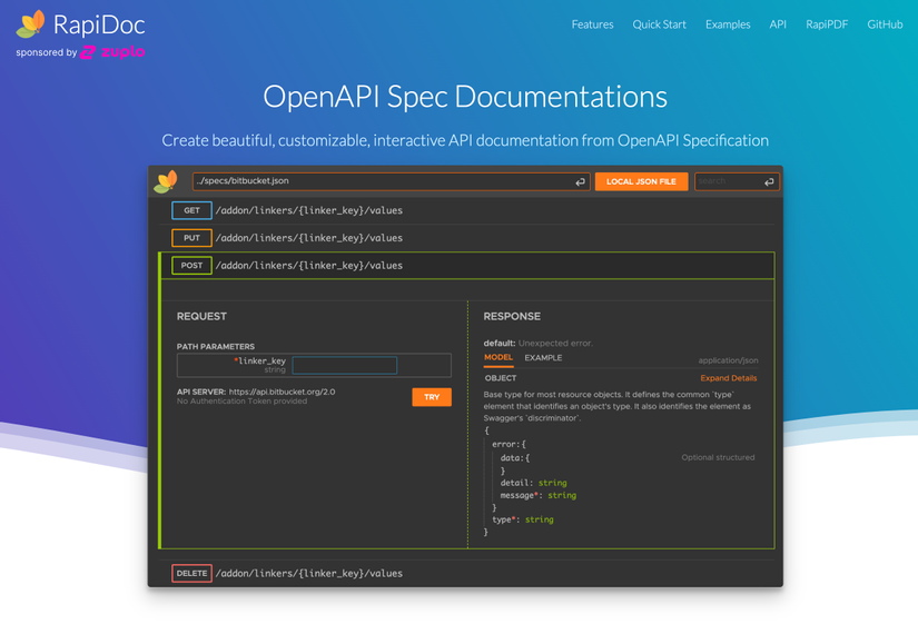 Công cụ hiển thị tài liệu OpenAPI nhẹ, có thể nhúng vào trang web. Tốc độ hiển thị nhanh và hỗ trợ kiểu tùy chỉnh, nhưng tính năng tương đối đơn giản.