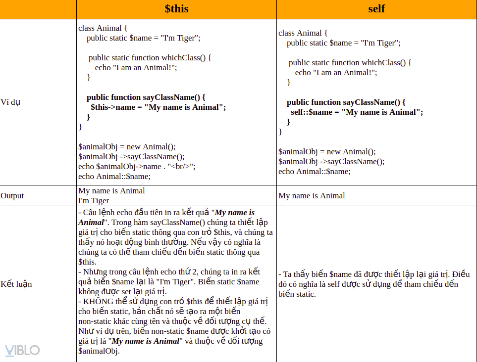 - Trong PHP, không nên sử dụng con trỏ $this để thiết lập giá trị biến static - thay vào đó, sử dụng $self.