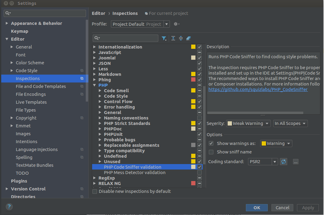 Sau đó bạn lựa chọn các cài đặt, hiển thị lỗi ở mức warning hay error và chọn Coding standard