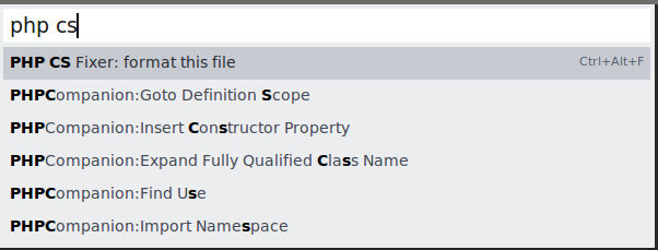 Ctrl + Shift + P và Tìm kiếm PHP CS Fixer. Thậm chí bạn có thể nhìn thấy tổ hợp phím tắt của nó không, ấn luôn nếu bạn đang ở file lỗi đó cho ngầu như quả bầu