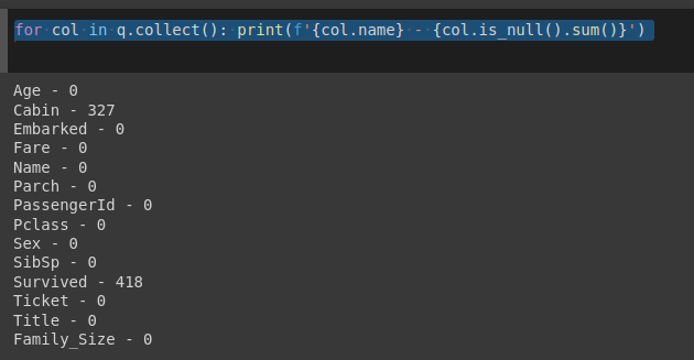 for col in q.collect(): print(f'{col.name} - {col.is_null().sum()}')