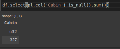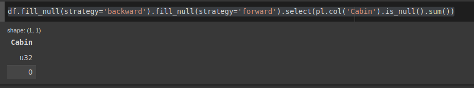 df.fill_null(strategy='backward').fill_null(strategy='forward').select(pl.col('Cabin').is_null().sum())