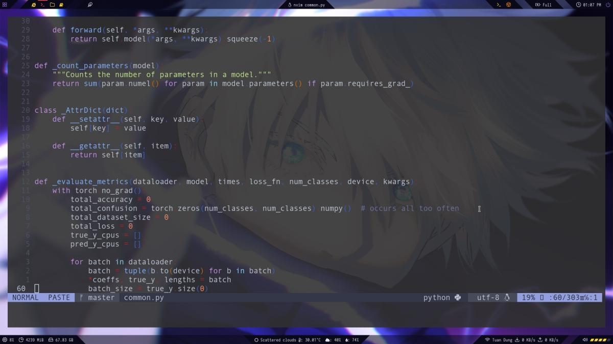 Việc có một môi trường desktop mạnh và ổn định là rất tốt cho một lập trình viên có thể hoàn thành công việc của họ một cách hoàn hảo nhất. Bên cạnh đó một yếu tố giúp bản thân mình tập trung hơn khi làm việc đó là giao diện của máy mình, nếu mình có một bố trí (Layout) đẹp cho màn hình, các cửa sổ transparent xếp chồng lên nhau (hoặc là nằm cạnh nhau), thoải mái code trong khi vẫn ngắm nhìn hình nền (background) của bản thân điều đó khiến tinh thần mình rất thoải mái.
