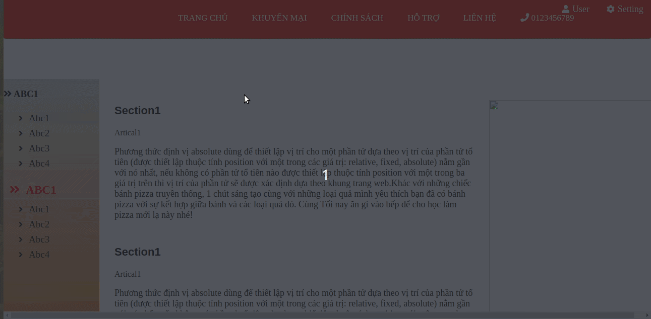 Tương tự như ví dụ trên mình cũng thêm  position: absolute và xét  cách trên 0px, phải