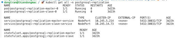 Chạy lệnh kubectl get all -n postgresql-replication để kiểm tra hoạt động các pod đã Running hết chưa nha