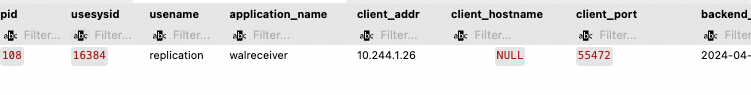Nếu các pod không lỗi gì thì mình connect đến postgresql master và chạy sql SELECT * FROM pg_stat_replication; để kiểm tra slave đã kết nối đồng bộ dữ liệu chưa nhé, nếu hiển thị như bên dưới thì ok rồi nha