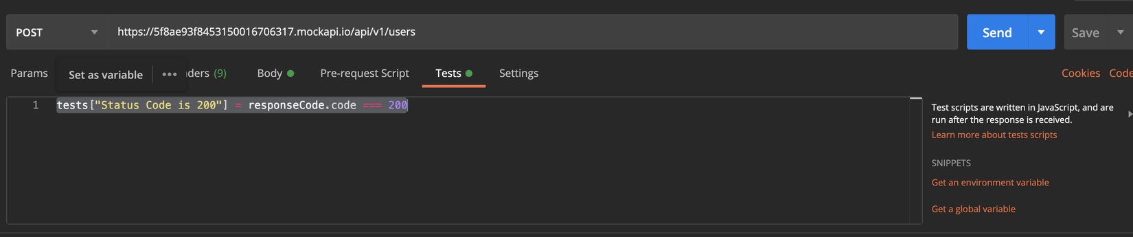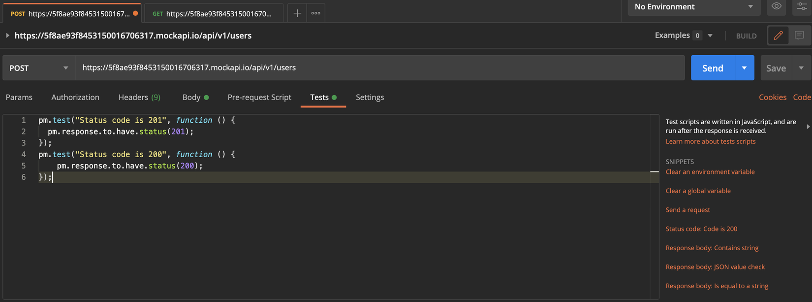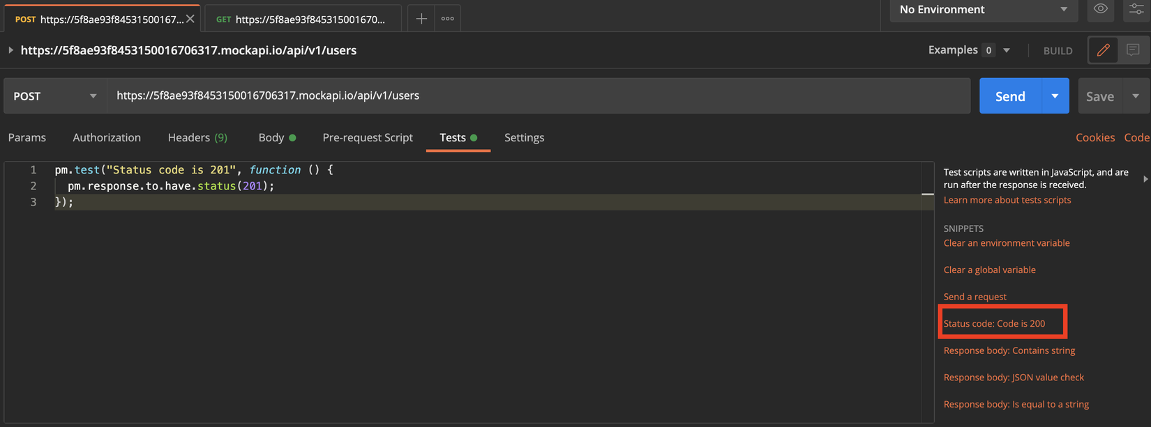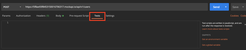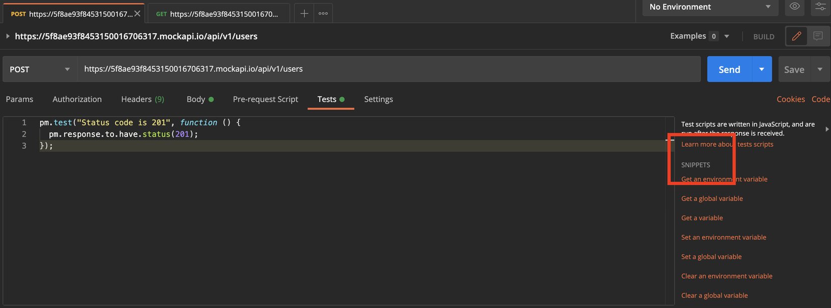 Vì có nhiều lần test được sử dụng theo các request khác nhau và có nhiều request xuất hiện trong một collection nên viết một số code test thường lặp đi lặp lại thường xuyên. Trong Postman, phần này được gọi là Snippets. Đoạn code là được viết trước trong Postman để sử dụng mà không cần viết toàn bộ code. Việc này tiết kiệm rất nhiều thời gian và ngăn ngừa các lỗi có thể xảy ra trong khi viết code theo cách thủ công.
