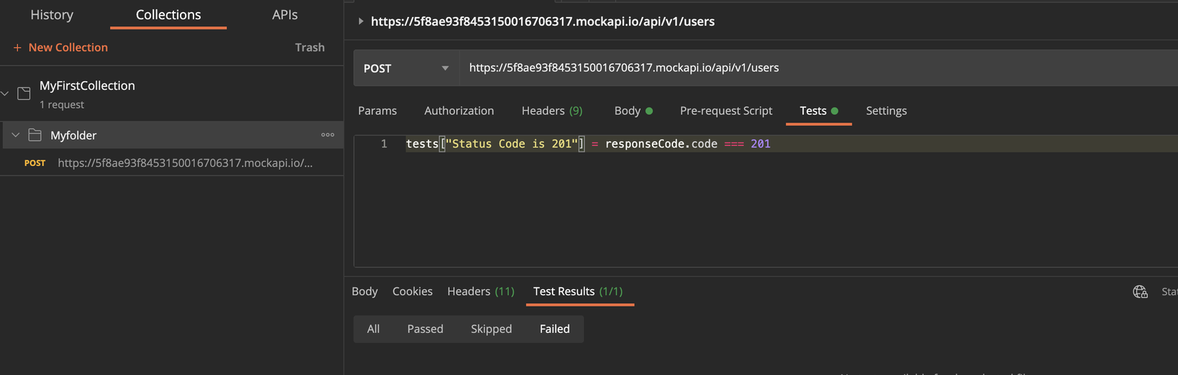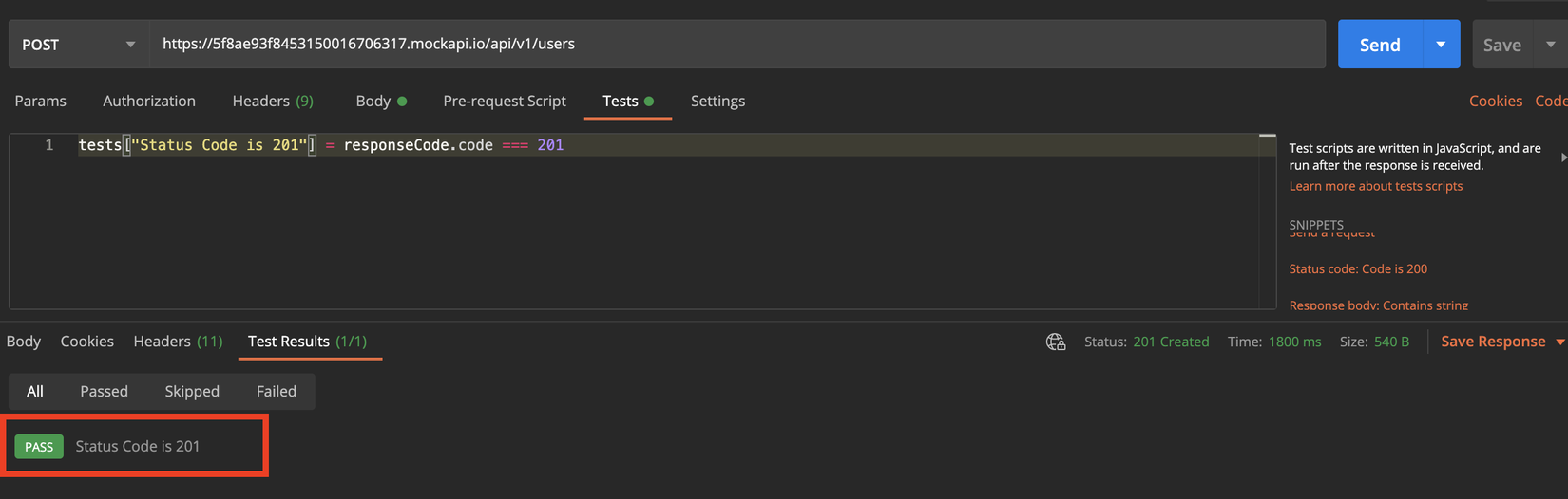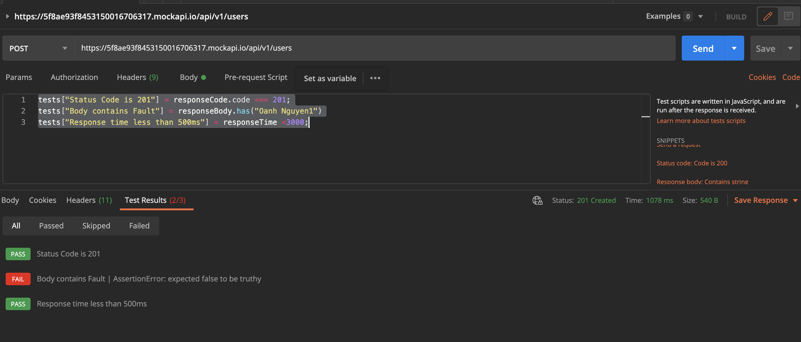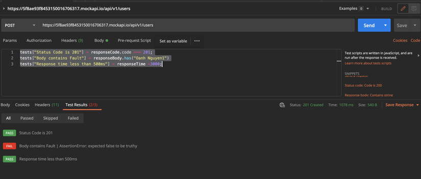 Test case đầu tiên của chúng ta đã pass vì chúng ta có response status code là 201 và test thứ ba của chúng ta đã pass vì thời gian response của chúng ta là 1082ms, nhỏ hơn 3000. Thời gian response của bạn có thể thay đổi.