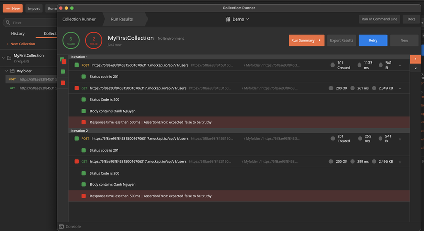 - Có hai lần lặp lại mỗi request. Trong lần lặp đầu tiên, tôi nhận được thời gian phản hồi là 260ms lớn hơn 250 ms, điều này gây ra một fail trong test tương ứng đó.