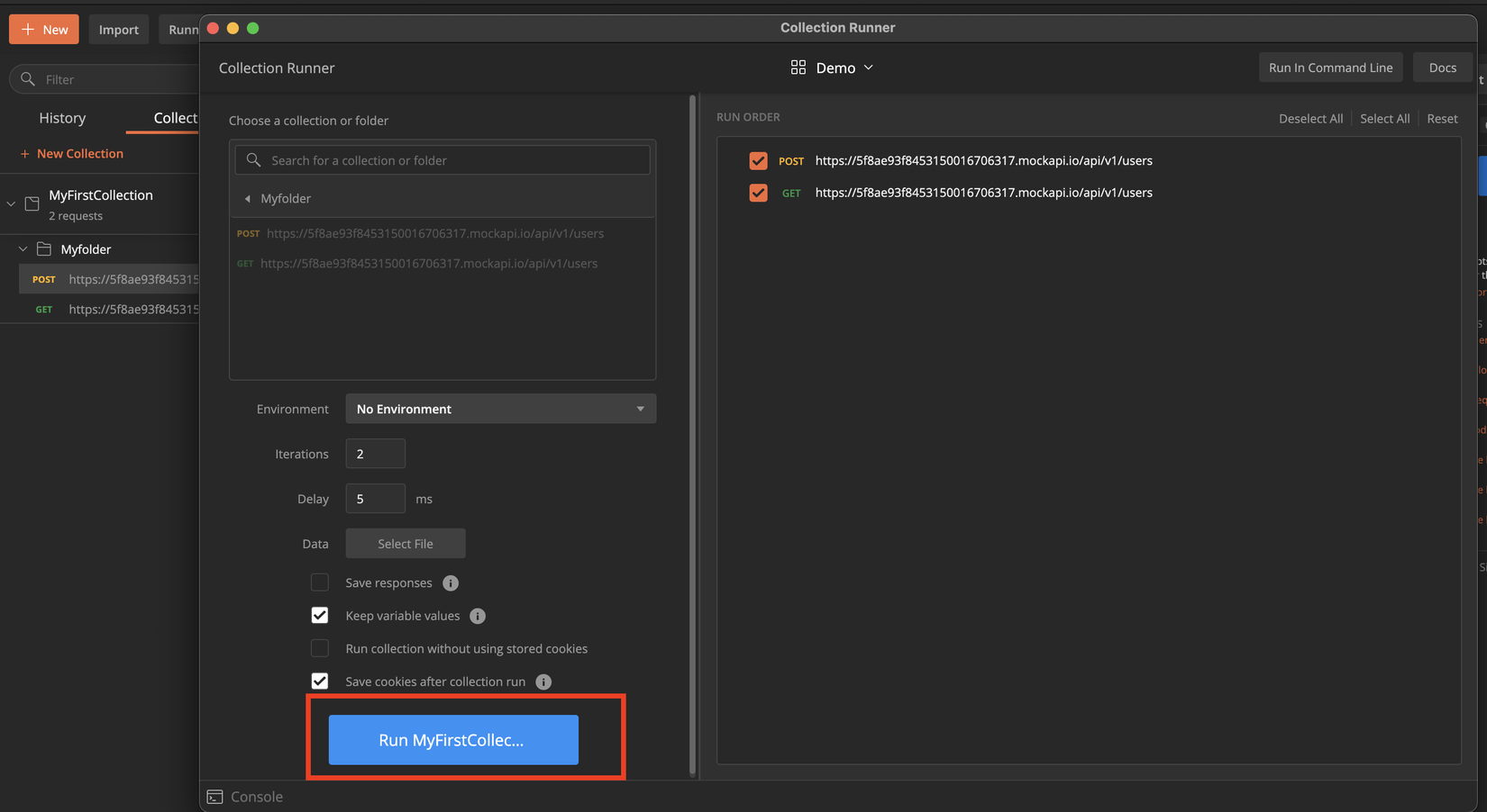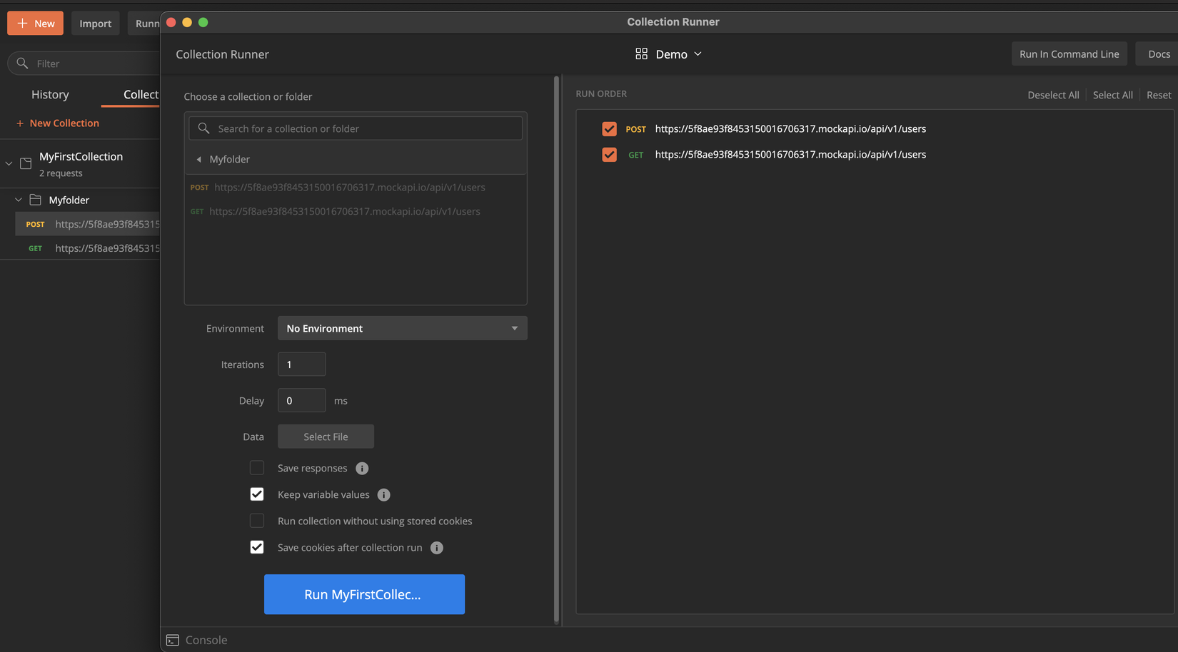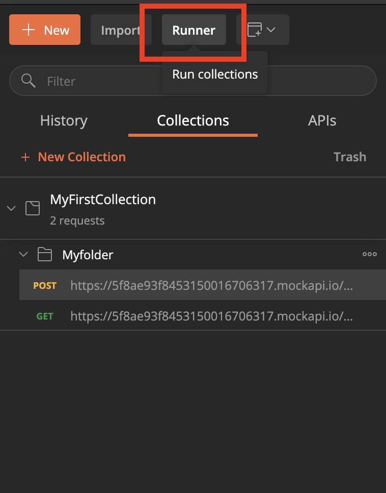 Một trình chạy collection trong Postman như đã nói ở các bài trước đây được sử dụng để chạy toàn bộ collection cùng nhau. Trình chạy collection chạy tất cả các request trong collection hoặc thư mục (bất cứ thứ gì bạn chọn) cùng một lúc. Collection runner trong Postman không hiển thị bất kỳ respone nào, nó được sử dụng để test các case xem chúng có pass hay không. Bảng điều khiển Collection runner hiển thị tất cả các bài test cùng nhau và kết quả của chúng. Để chạy bộ collection trước tiên hãy đảm bảo rằng bạn có ít nhất hai request trong thư mục MyFolder bên trong MyFirstCollection như hình.