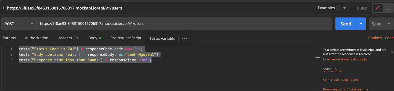 Đoạn mã mẫu trong Postman để thêm test nhanh