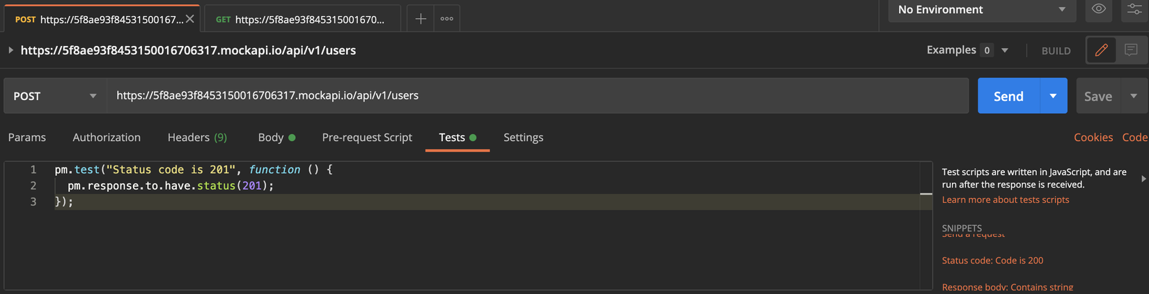Viết TEST trong Postman tương tự như định nghĩa một test case. Trong Postman, chúng ta check bất kỳ điều gì chúng ta cần biết về request. Ví dụ: nếu ta cần biết liệu request của ta có trả về status code là 201 hay không, việc này có thể làm được trong Postman. Ngoài ra, một request có thể được thông qua nhiều test case và tất cả chúng có thể được report cùng lúc trong lúc request hoàn thành.