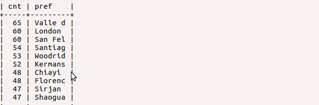 FROM sakila.city_demo GROUP BY pref ORDER BY cnt DESC LIMIT 10;