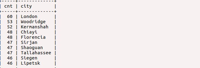 FROM sakila.city_demo GROUP BY city ORDER BY cnt DESC LIMIT 10;