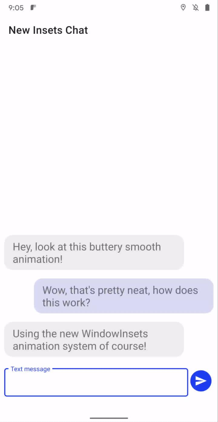 Synchronized IME transitions Một bộ API mới cho phép bạn đồng bộ hóa nội dung của ứng dụng với IME (viết tắt của input method editor hay đơn giản là soft keyboard ) và các thanh hệ thống khi chúng hoạt hình trên và ngoài màn hình, giúp dễ dàng tạo ra tự nhiên, trực quan và không bị giật . Ngoài ra, các ứng dụng có thể kiểm soát IME và chuyển đổi thanh hệ thống thông qua API WindowInsetsAnimationControll.