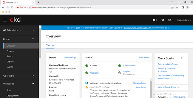 -Mở trình duyệt vào: https://console-openshift-console.apps.cloud.okd.local/ login với user kubeadmin và password ở trên.