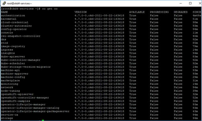 Kiểm tra các CO (ClusterOperator) đã lên hết version 4.7.0-0.okd-2021-08-22-163618 chưa