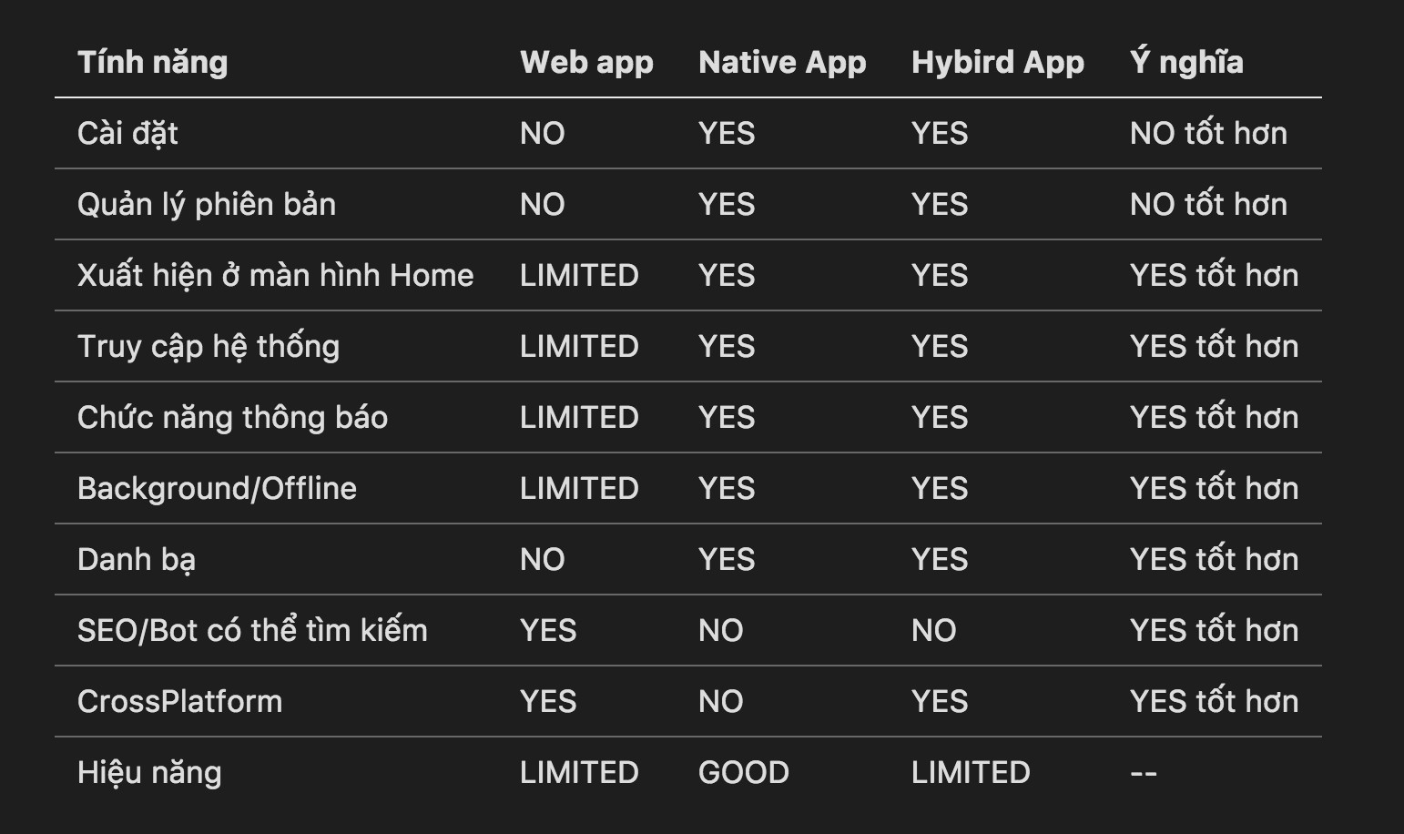 Để có một cái nhìn rõ hơn về PWA thì mình nghĩ chúng ta nên nhìn về Native App và Web App ở góc độ ưu và nhược của từng đối tượng. Và khi hiểu được sự khác nhau cũng như nhược điểm của từng bên thì chúng ta sẽ hiểu được mục đích ra đời của PWA như là một giải pháp hoàn thiện cho cả 2 nền tảng này bằng cách mang cho mình ưu điểm của cả hai bên.