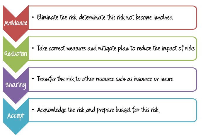Người quản lý dự án cần chọn các chiến lược sẽ giảm thiểu rủi ro đến mức tối thiểu. Người quản lý dự án có thể chọn giữa bốn chiến lược ứng phó rủi ro sau đây