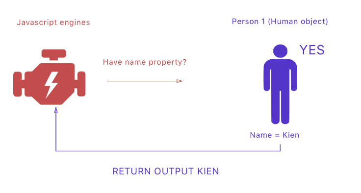 Khi chúng ta cố gắng truy cập thuộc tính của một đối tượng (ở đây là person1.name), việc đầu tiên javascript engines làm là sẽ cố gắng tìm thuộc tính chúng ta cần trên đối tượng, nếu thuộc tính ** tồn tại** trên đối tượng, như thế thì quá đơn giản, chúng ta chỉ việc xuất ra kết quả.